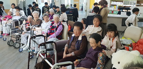 안마하는 시간이 끝나고 아이들과 어르신들이 함께 앉아 기념촬영을 하였습니다.