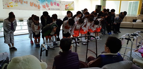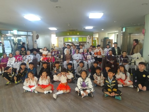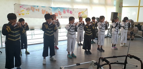 처음에는 고학년 학생들의 리코더와 오카리나 연주로 어르신들의 귀를 즐겁게 해주었습니다.