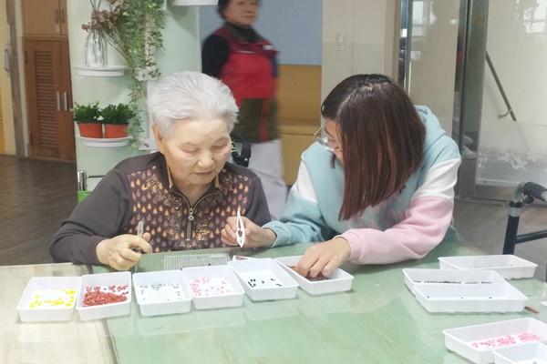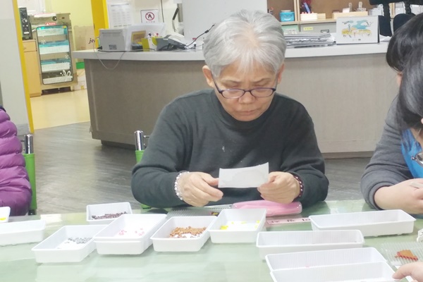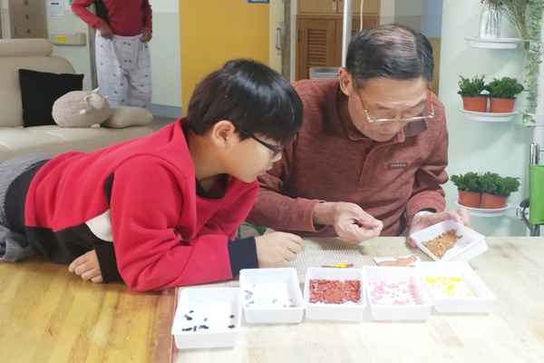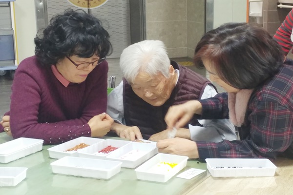 어르신과 봉사자를 1명씩 짝지어서 펄러비즈 만들기 프로그램을 진행하였으며,