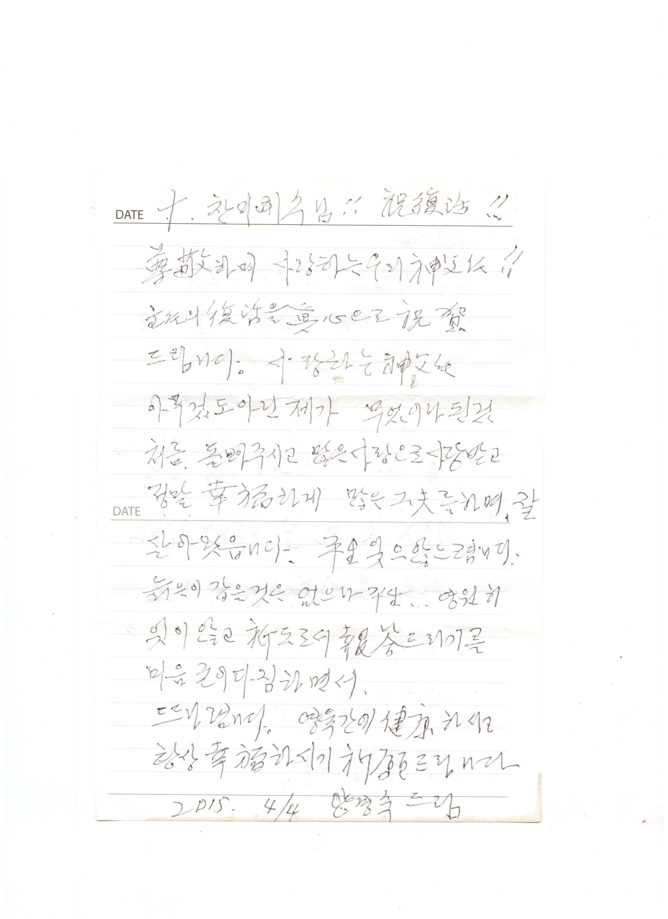 양경숙 어머님께서 퇴원하기 전 신부님께 보낸 감사 편지를 함께 나누고자 글을 씁니다.